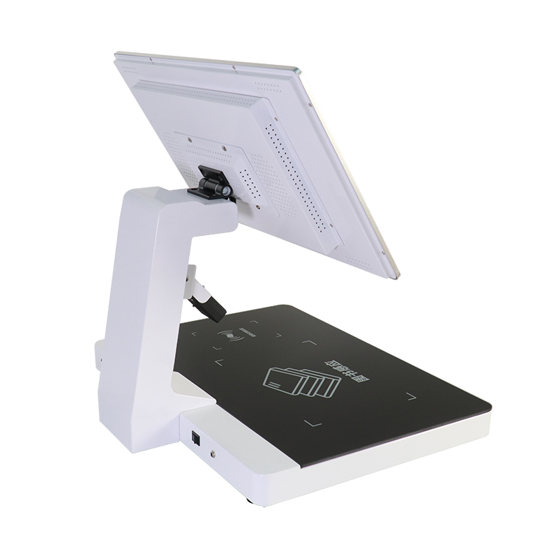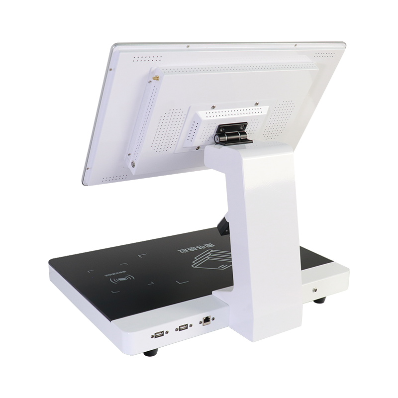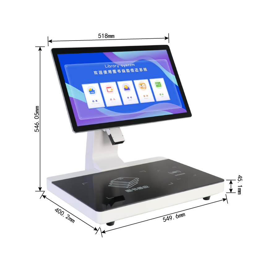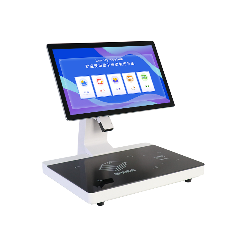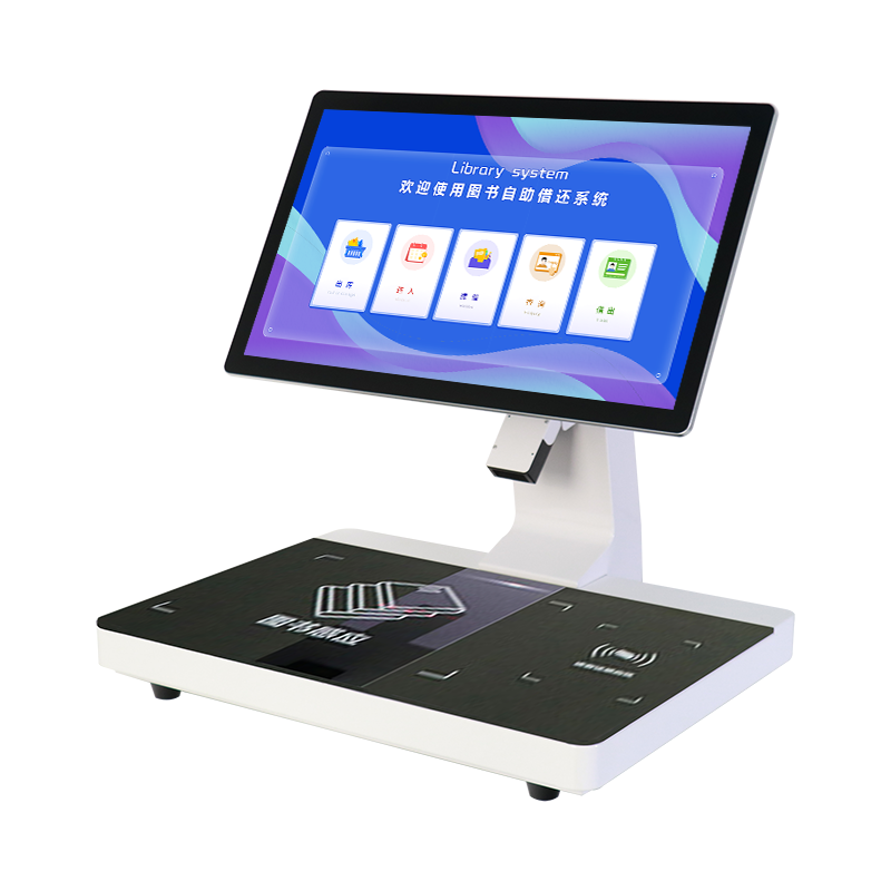一体式馆员工作站是一种新型的智能化设备,配备触摸显示屏或简单操作的人机交流界面、图形界面,通过协议或其他网络及专用接口与图书馆自动化系统数据相连接,馆方工作人员对图书进行标签加工时,使用设备对粘贴在图书上的RFID大江平台进行加工,通过条码扫描器扫描图书上的条形码,同时识别图书上的大江平台,对大江平台和图书条码进行标签初始化操作。图书加工完成后上架,读者可以通过自助借还设备对图书进行自助借还流通操作。平时馆方工作人员不用设备进行图书加工时,可以切换到自助借还软件功能,软件功能切换后,设备可作为自助借还机使用。