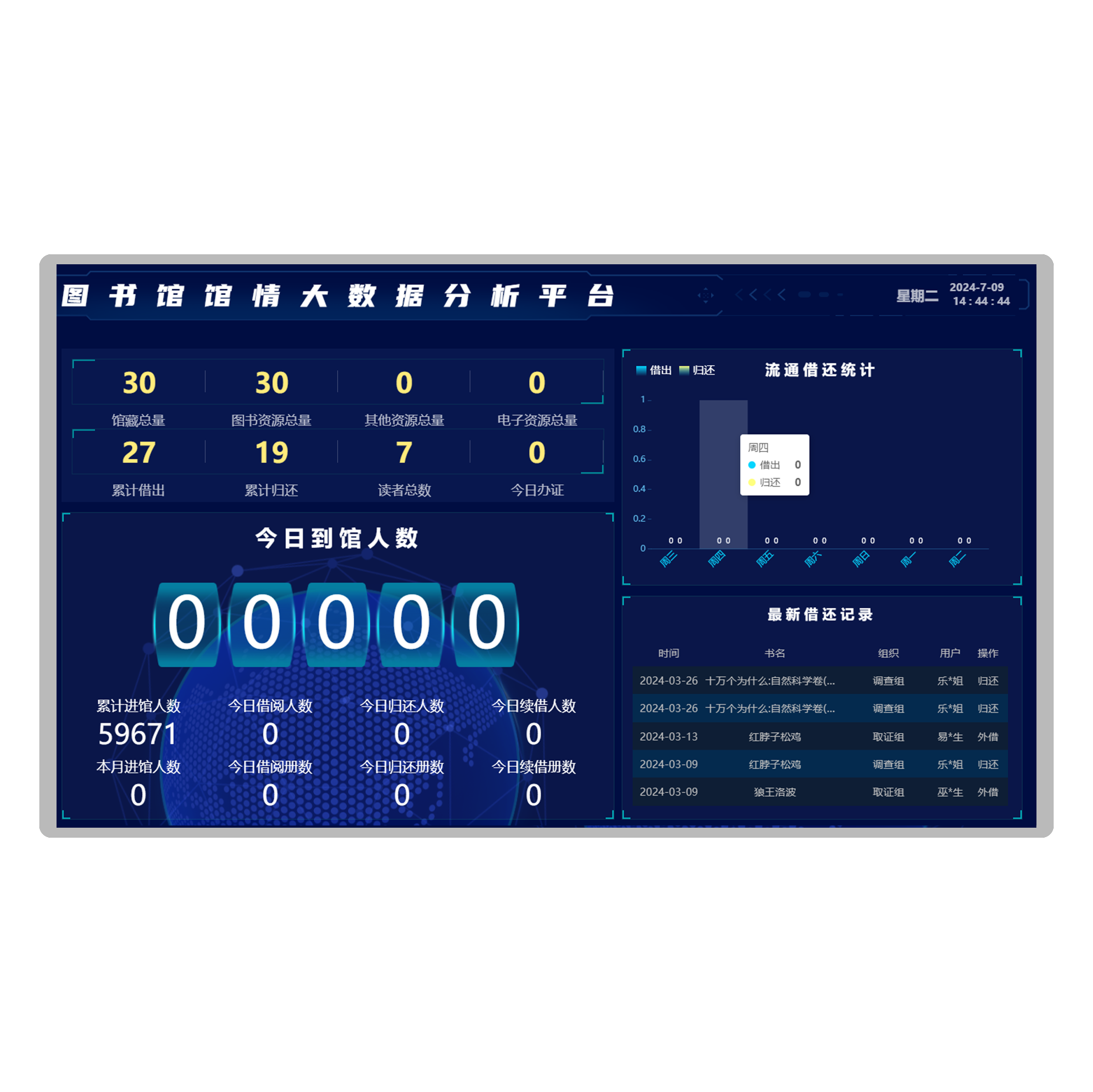 DGQZS43 / DGQZS56 大数据馆情展示平台能直观了解图书馆的借还书情况各个分馆之间的借阅 排行量,总借阅量、总办证量减少图书馆管理员去统计各馆借阅量的时间 , 有效提高图书馆的工作效 率及服务效率。能够实时编辑发布最新数据,实时展示图书馆进出馆人数、借阅排行榜、图书排行榜、 图书推荐、天气预报、图书馆资讯、名人名言等信息,还可以个性化定制信息展示。可用于图书档案、 金融通讯,影院 KTV、酒店餐饮、大型商超、政府、医疗医院、企业单位等场景。