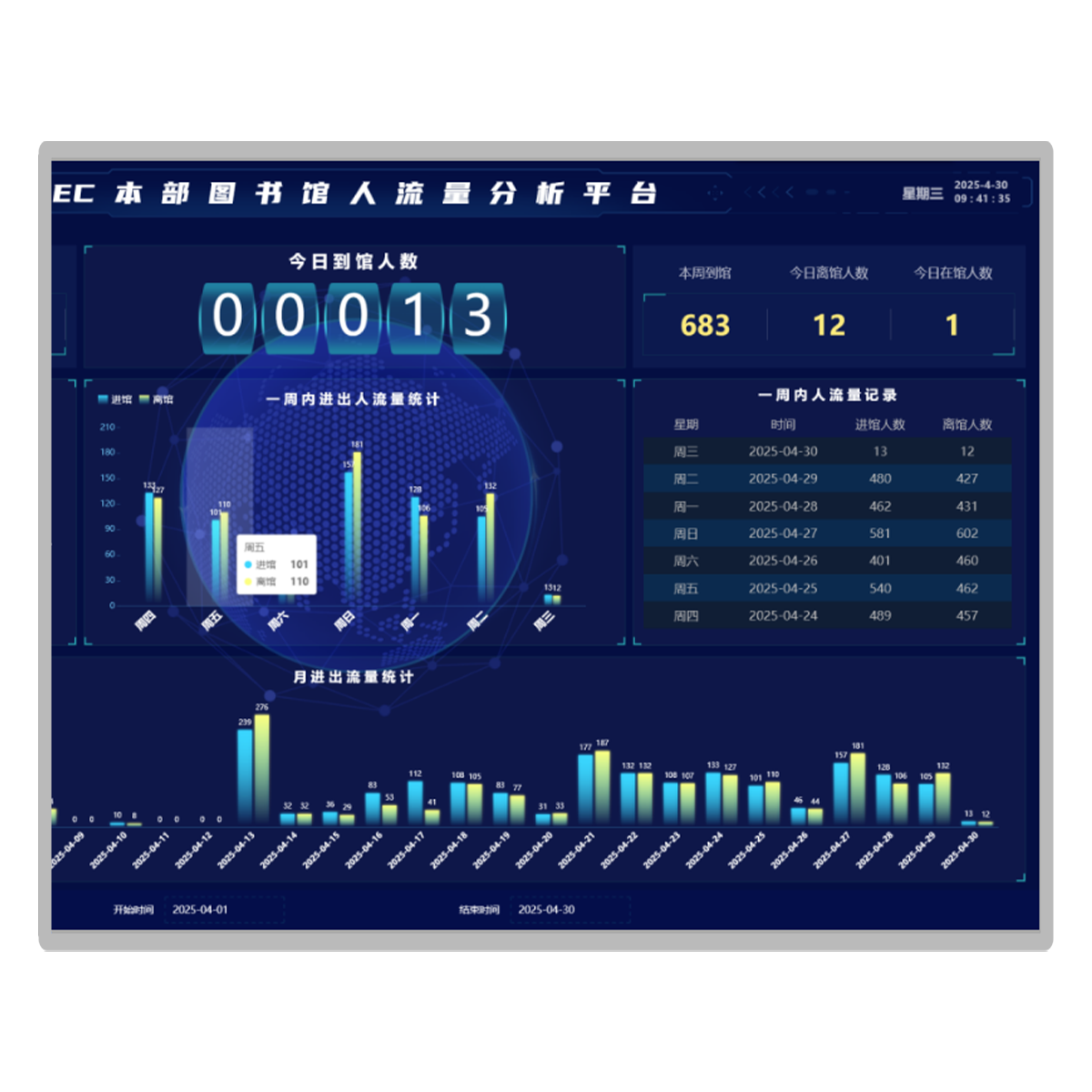 本系统可以与图书馆的图书管理系统无缝连接,通过信息化技术手段对图书馆进出人流量方面的数据进行采集、整理和分析,以便更好地管理统计图书馆各方面数据,辅助和提高图书馆的运营效率和服务质量。