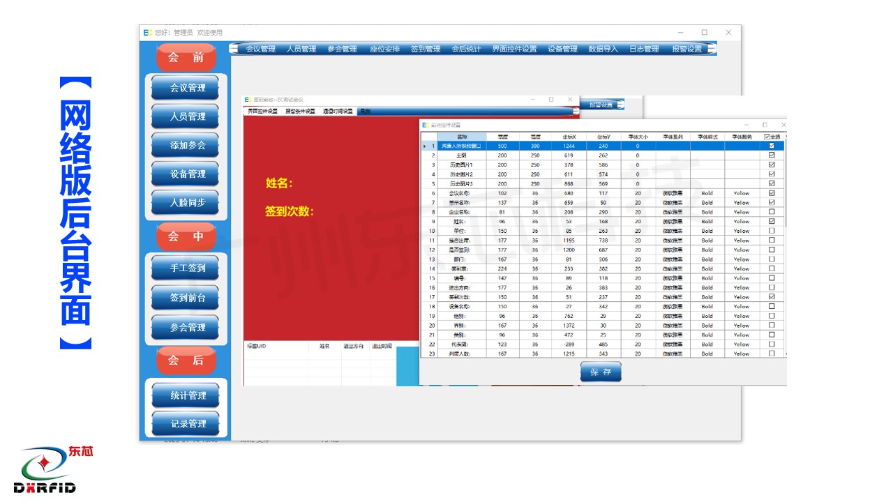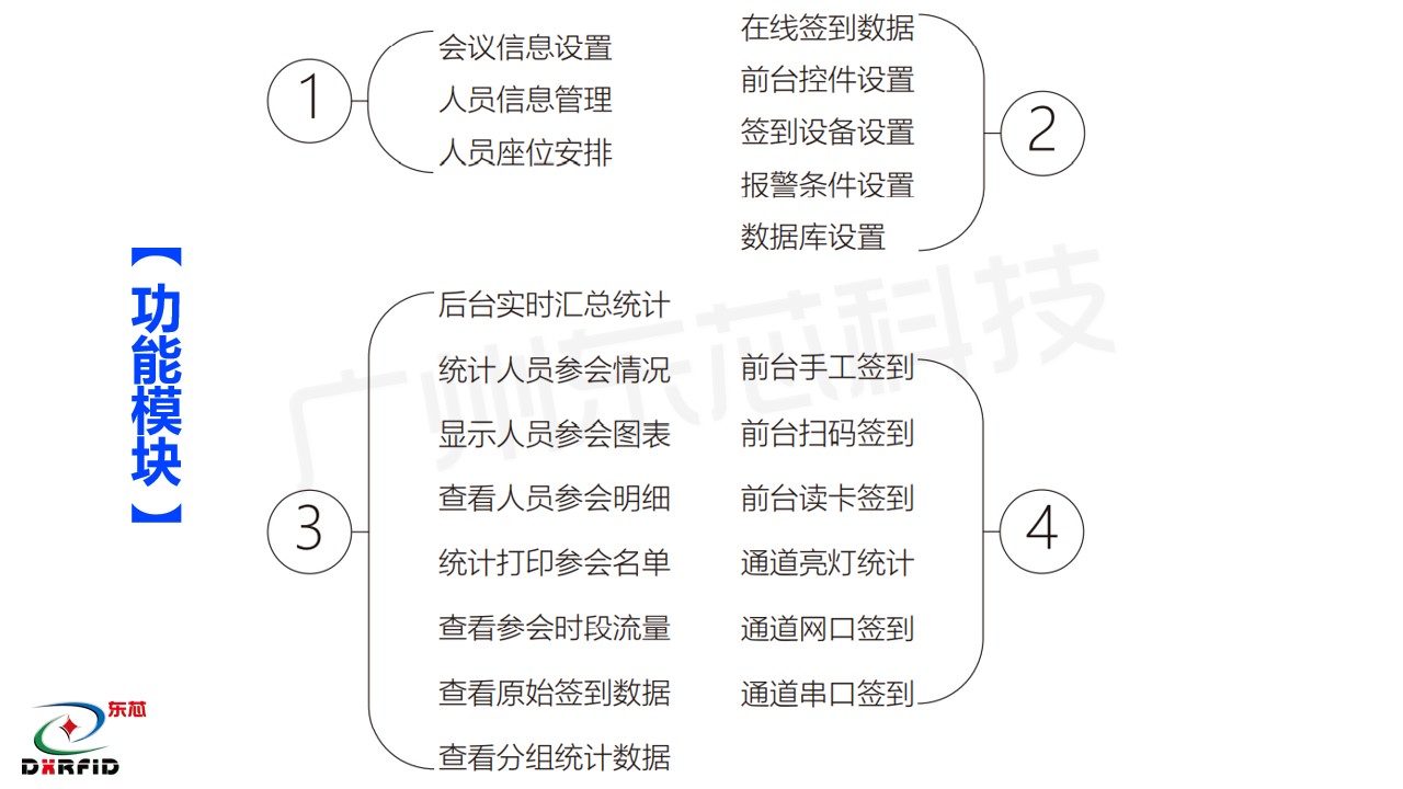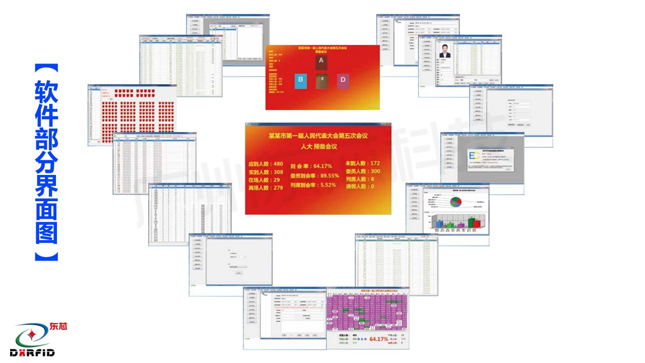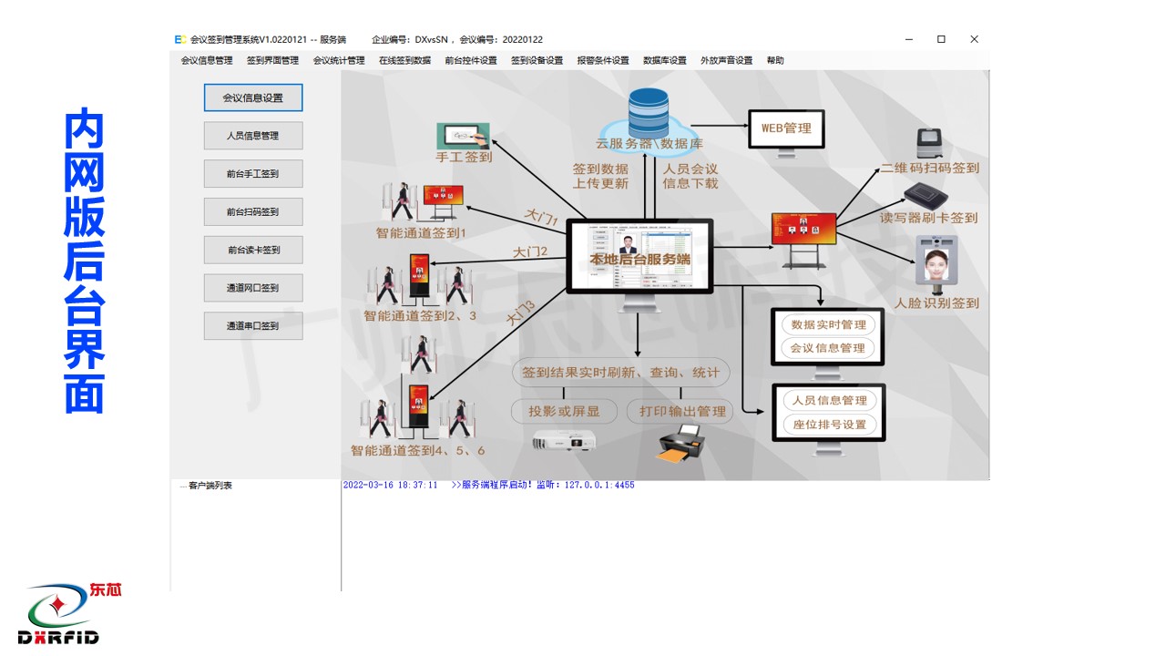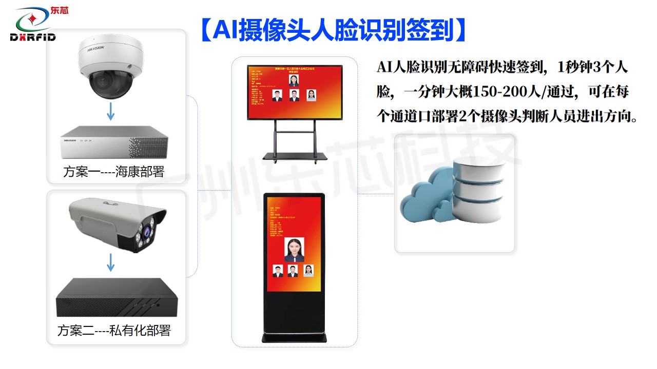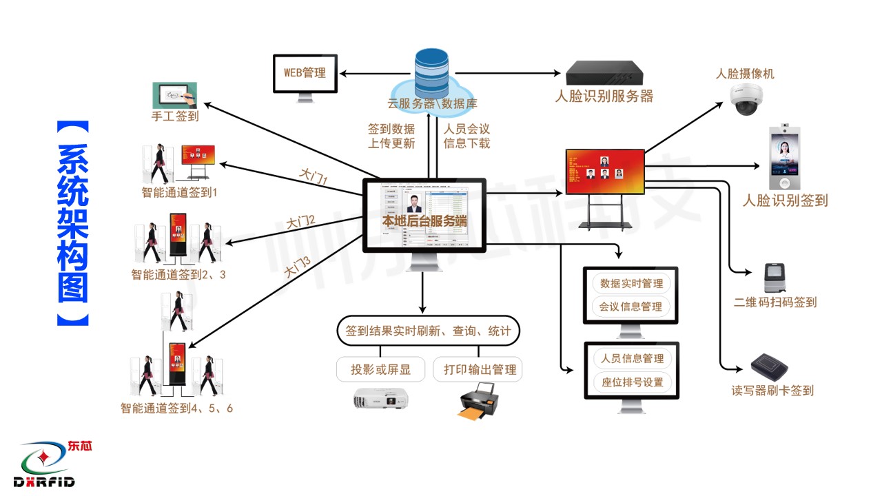 化系统集成为手段,通过 RFID 大江平台证件卡,智能感应通道签到门,人脸测温识别技术等,对企事业单位的会务人员参会签到,进行智能化、