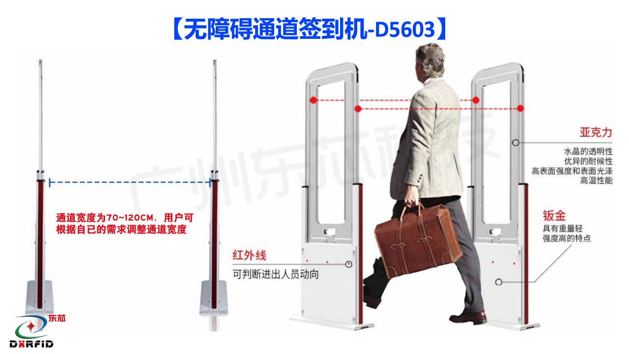 东芯开放式无障碍智能通道集成了13.56M高性能大功率读写器和红外传感器技术,能快速准确地识别带卡及无带卡人员的进出,并可通过红外
