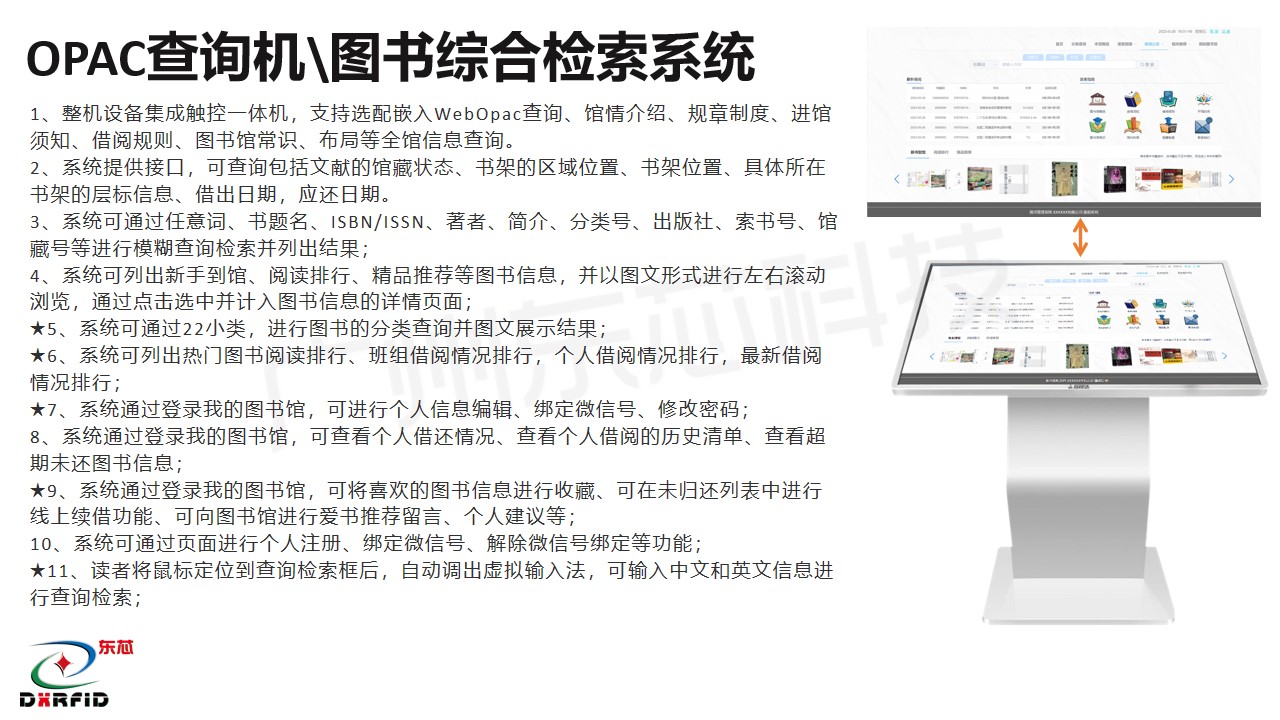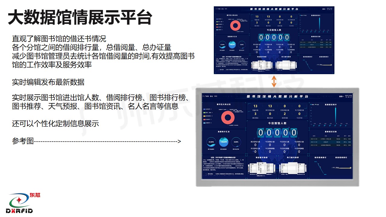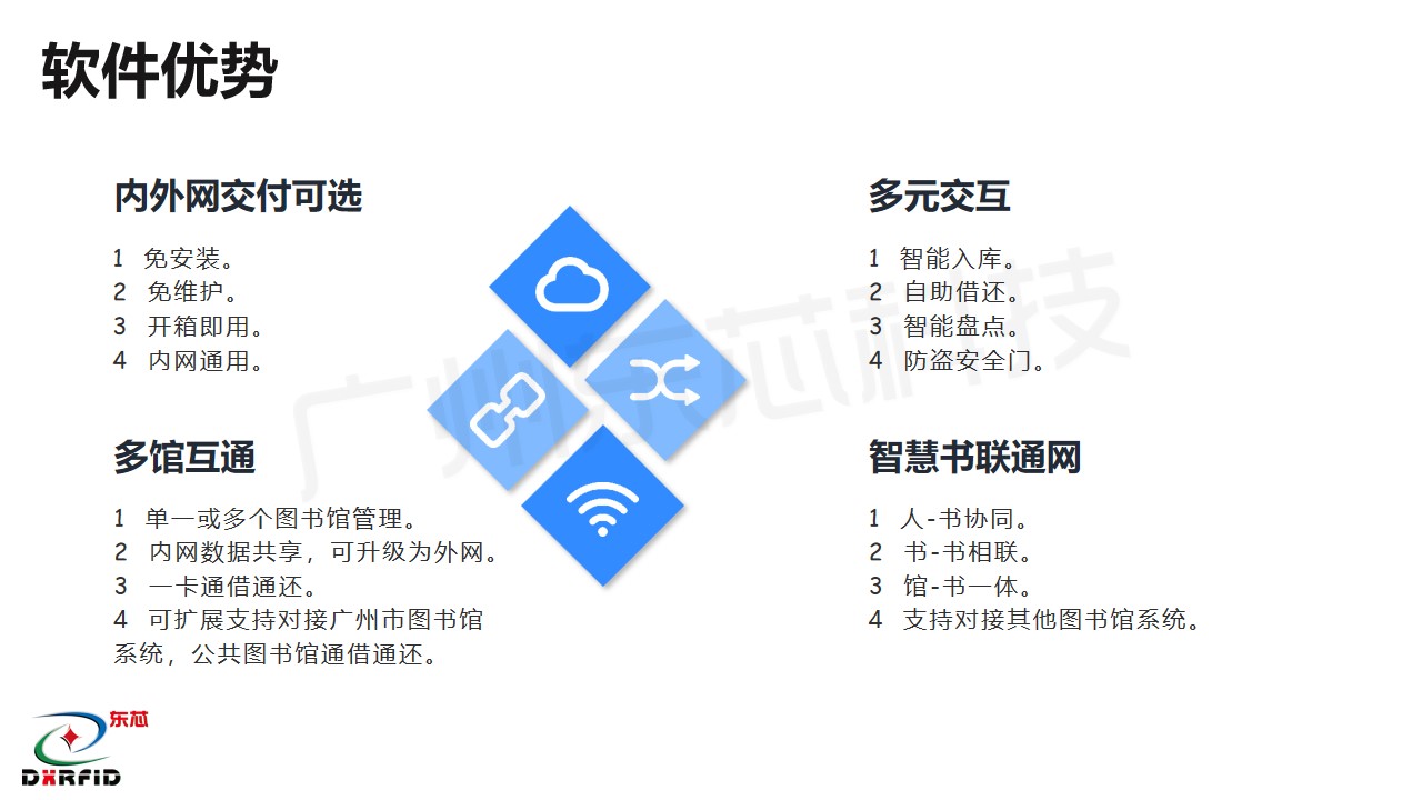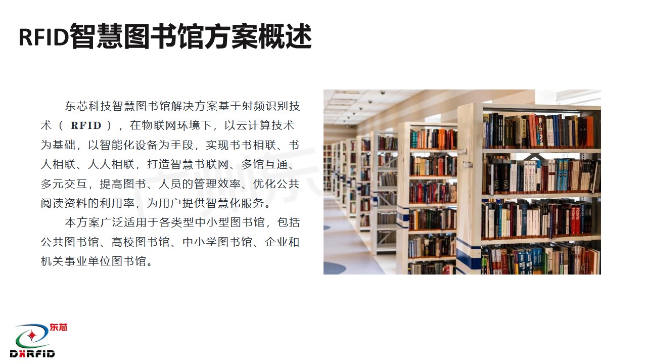 东芯科技智慧图书馆解决方案基于射频识别技术( RFID ),在物联网环境下,以云计算技术为基础,以智能化设备为手段,实现书书相联、书人相联、人人相联,打造智慧书联网、多馆互通、多元交互,提高图书、人员的管理效率、优化公共阅读资料的利用率,为用户提供智慧化服务。